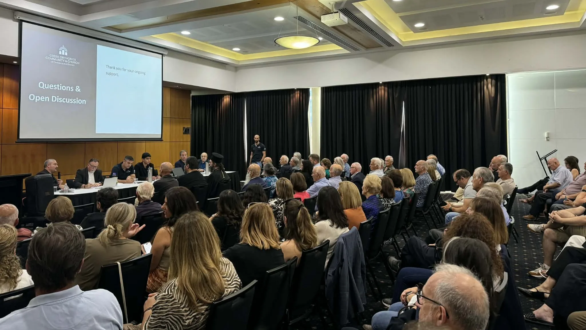 The session brought together clergy, community leadership and Archdiocesan representation, including parish priest Fr Petros Kipouros and His Grace Bishop Athenagoras of Canberra, reflecting the importance of the discussion for the local faithful.