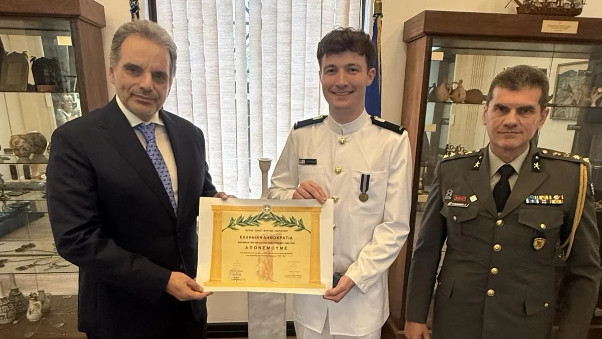 The Ambassador of Greece to Australia, Stavros Venizelos, together with the Defence Attaché of the Embassy of Greece in Australia, Colonel Kyriakos Kyriakakos, presented Commemorative Medals of the Hellenic Republic to Maria Robson and Cadet James Callen during a ceremony at the Embassy of Greece in Canberra on 6 March 2026.