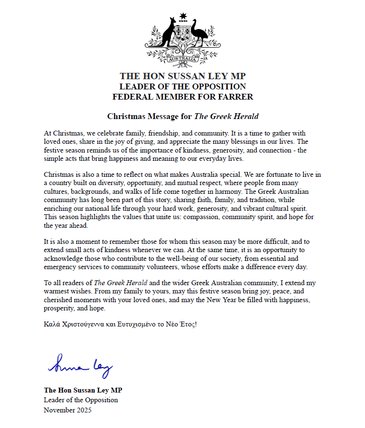 In her message, Ms Ley reflected on Australia’s diversity and paid tribute to the longstanding contribution of the Greek Australian community, while also acknowledging volunteers, emergency services and those for whom Christmas can be a difficult time.