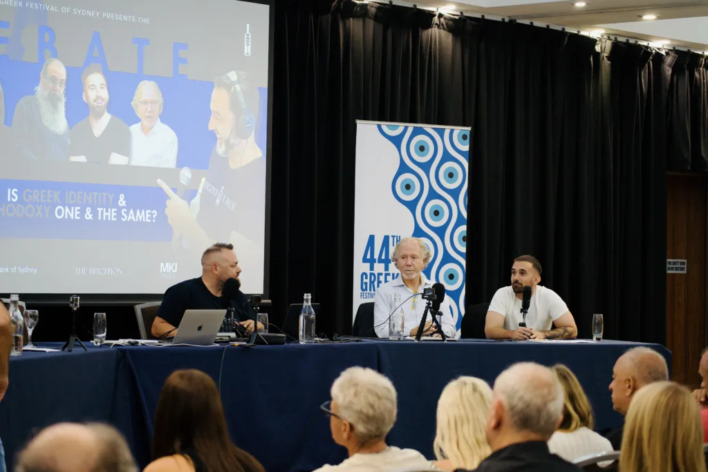The Brighton Hotel Sydney hosted an Ouzo Talk live debate on Monday night as part of the Greek Festival of Sydney, with panellists taking on one of the most enduring and emotionally charged questions in Hellenism: is Greek identity and Orthodoxy one and the same?