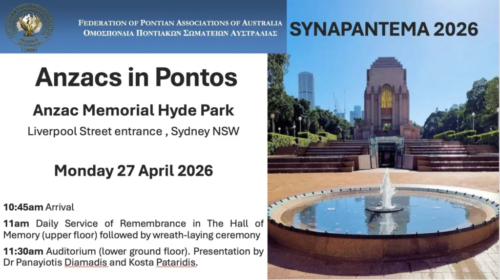 The Federation of Pontian Associations of Australia will conclude its flagship annual gathering, Synapantema 2026, with a commemorative event at the Anzac Memorial in Hyde Park honouring the shared wartime legacy between the Anzacs and Pontic Hellenism.