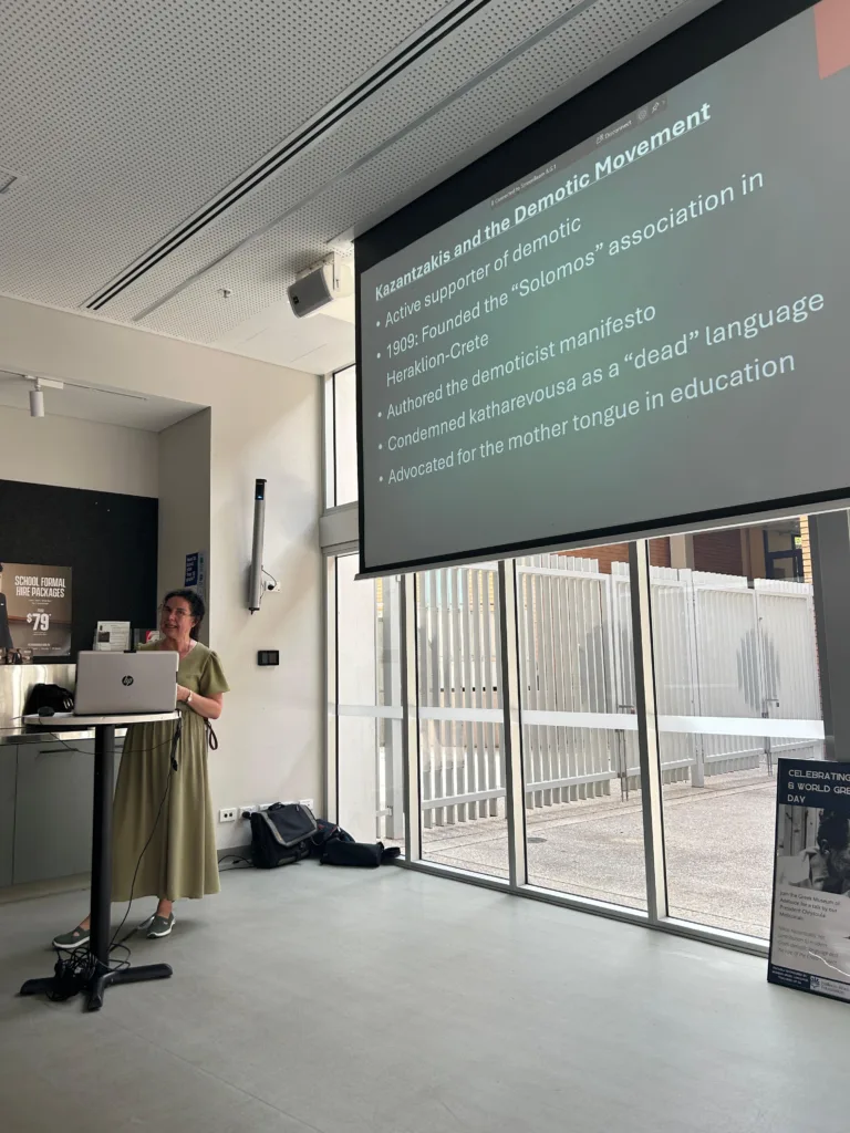 At the heart of the talk was Kazantzakis’ unwavering commitment to demotic Greek as the authentic language of the people. Melissinaki traced his active role in the Demotic Movement, including his early involvement in Crete and his opposition to Katharevousa, which he regarded as an artificial and alienating linguistic construct.
