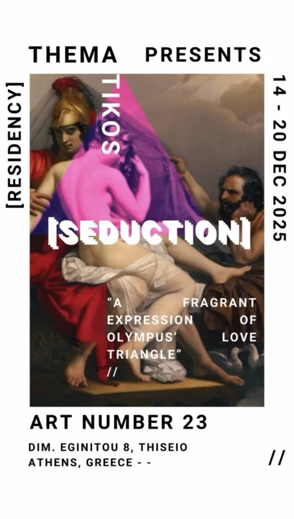 Thematikos is owned by Melbourne-based mother and son duo, with Con Panagiotopoulos leading this art series. Con studied perfumery in 2023 in Paris and the exhibitions merge his passion for fragrance, storytelling, and art to showcase Greek myths.
