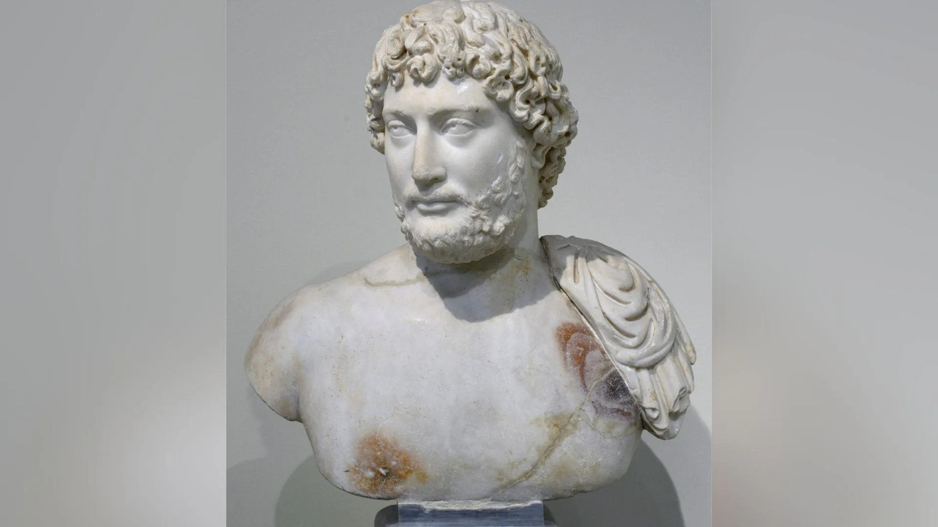So, of course, it is not surprising that statues of the bearded Emperor citizen are common in Athens as are representations of his (clean-shaven) young Greek lover Antinous. Perhaps most famous is the idealised portrait bust of the emperor carved from Pentelic marble and now in the National Museum of Athens, showing the emperor with his Greek beard. It was found near the Olympieion.