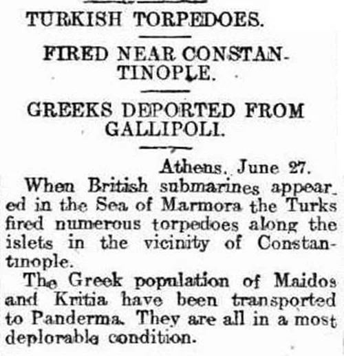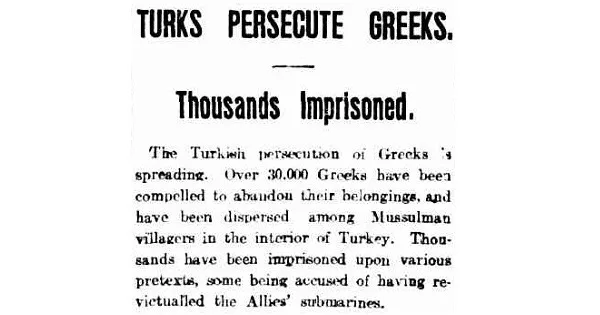 The arrest of more than 250 Armenian intellectuals and leaders in Constantinople on 24 April 1915, marking the beginning of the Armenian Genocide, occurred just one day before the Anzac landings at Gallipoli. Prior to the Anzac landing, over 30,000 Greeks lived in Gallipoli, and by 1919 very few remained. Australian newspapers reported on the persecution of Christian civilians in the region. On 16 July 1915, The Age described how more than 30,000 Greeks had been forced to abandon their homes and were dispersed into the interior, with many imprisoned under accusations of assisting Allied submarines. Such reporting indicates that awareness of civilian suffering accompanied the military conflict and circulated within the Australian press at the time.