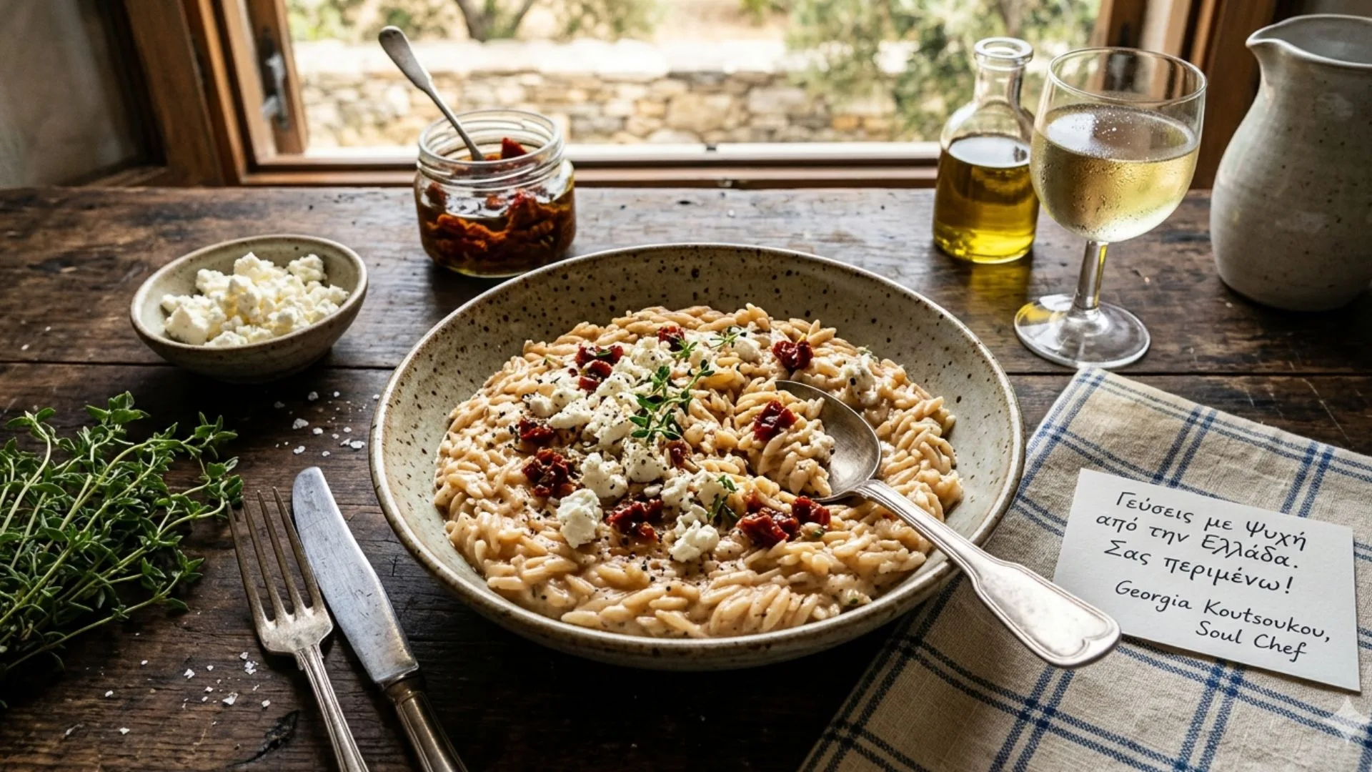 A comforting, risotto-style orzo that blends authentic Greek ingredients with a modern, velvety texture.