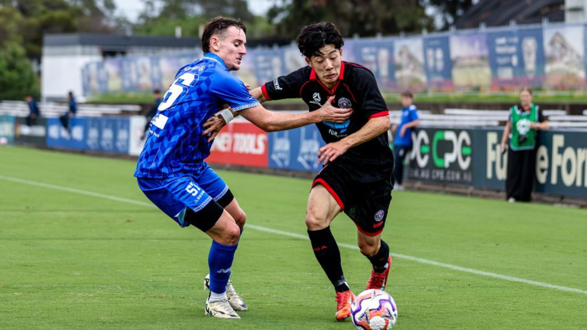 Blacktown began with greater control, but Olympic grew into the contest and nearly caught City off guard just after the quarter-hour mark with a clever free-kick routine. Two Blues players knelt in front of the wall as Yuto Fujita’s strike flashed narrowly wide, drawing interest from City custodian Cayden Henderson.